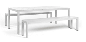 Materijal: Okvir i površine ploče stola te klupa su od aluminija, praškasto lakiranog u mat izvedbi. Površina je rebrasta (slatted top), što omogućuje brzo otjecanje vode i jednostavno čišćenje. Dostupne su boje: tortora, bianca i antracit.
